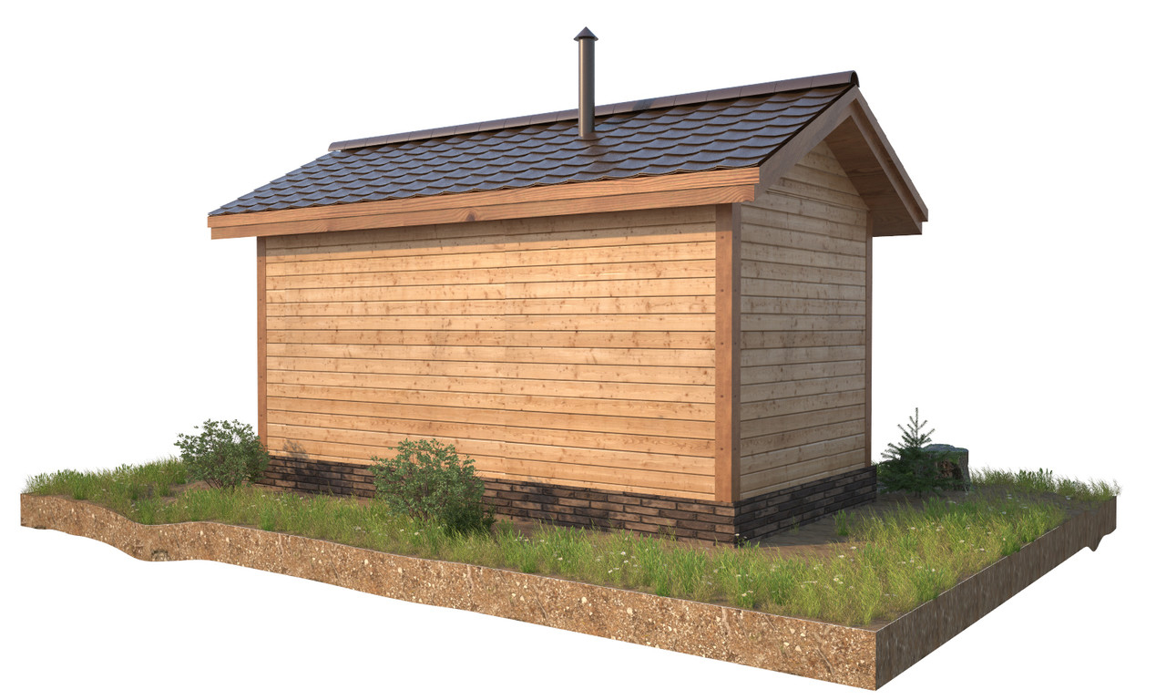 Удобство размеров бани позволяет построить баню с минимумом стыков по брусу, так как стандартный размер брусков 6 метров, соответственно остатков останется мало.