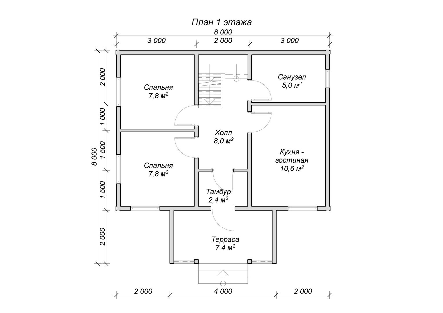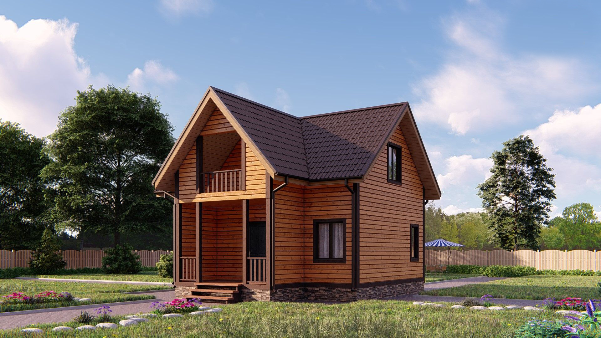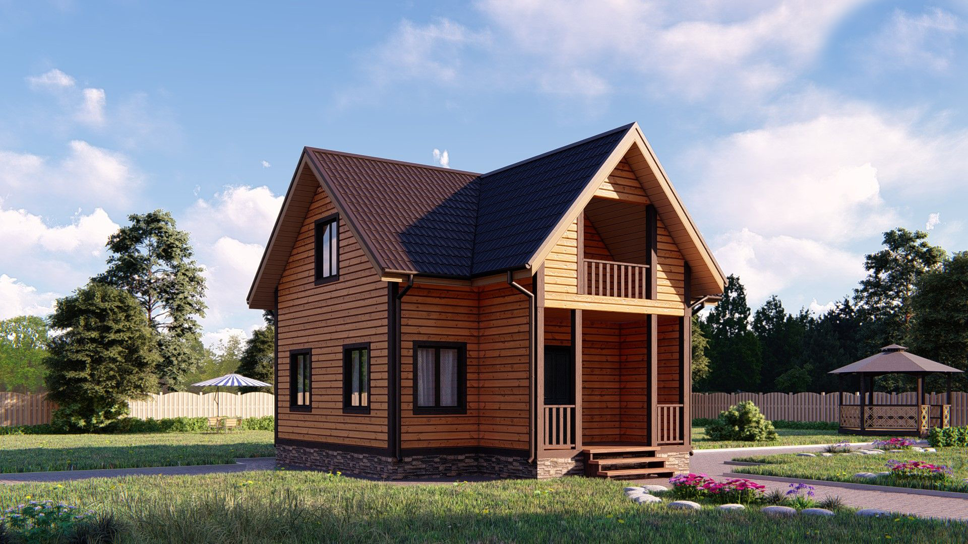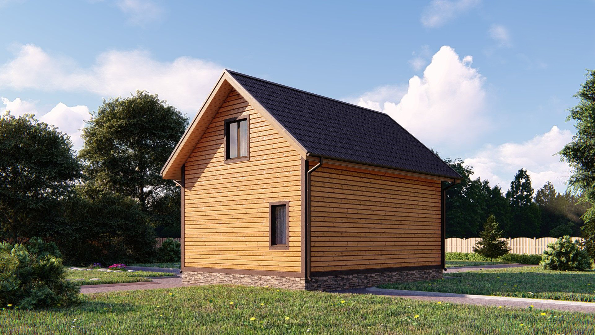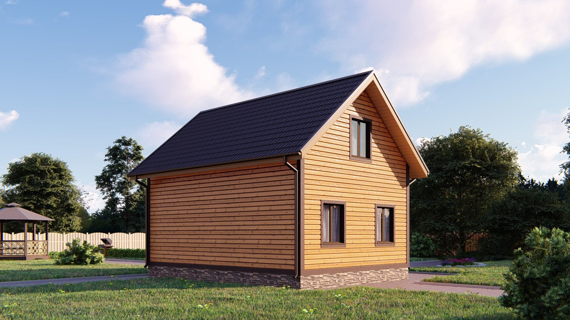 Двухэтажный дачный дом «Аскольд» 8*8 украсит любой садовый участок. За довольно лояльную цену вы получите каркасную коробку с перекрытием этажей и лестницей, накрытую профнастилом, основанную на фундаменте из бетонных блоков с внутренними перегородками. В базовой комплектации предусмотрено наличие 5 окон и одной двери, но количество проемов не ограничивается и учитывается при проектировании. Постройка обшита вагонкой снаружи.