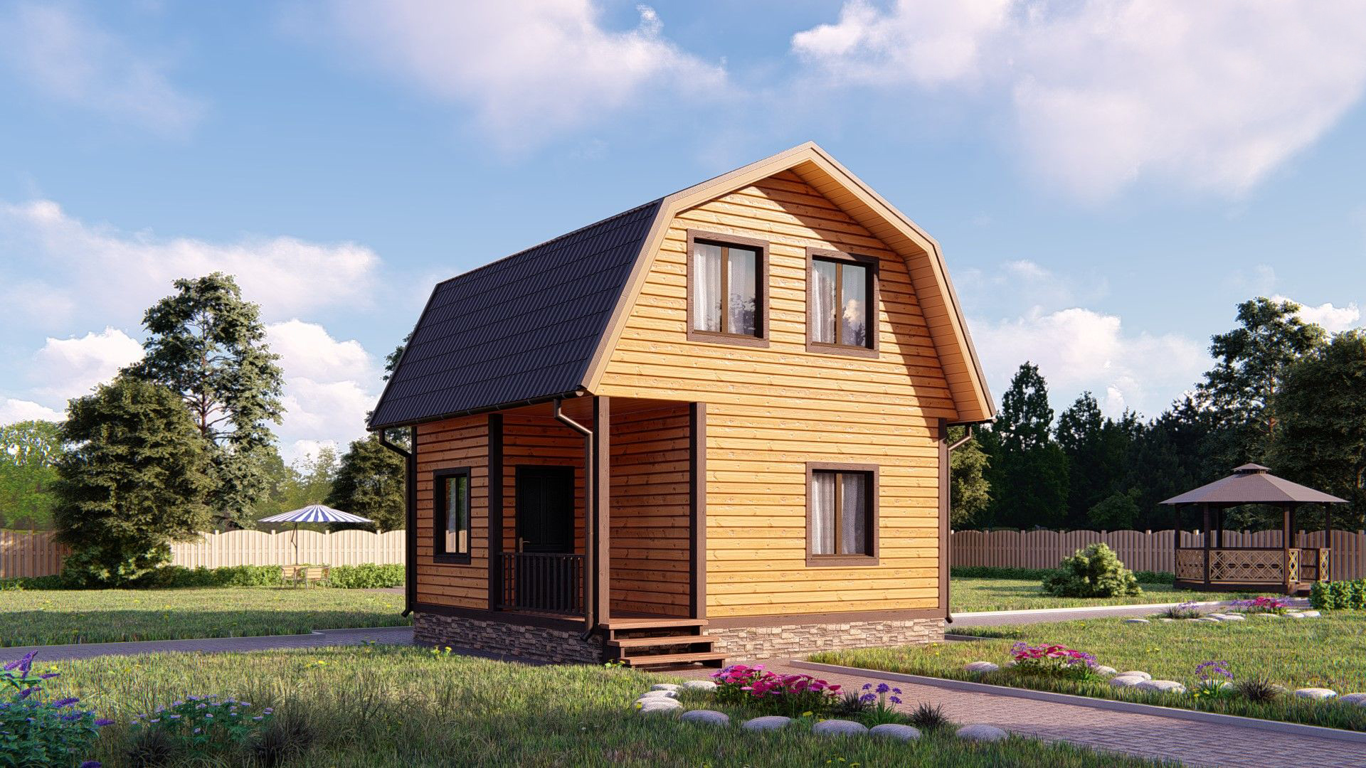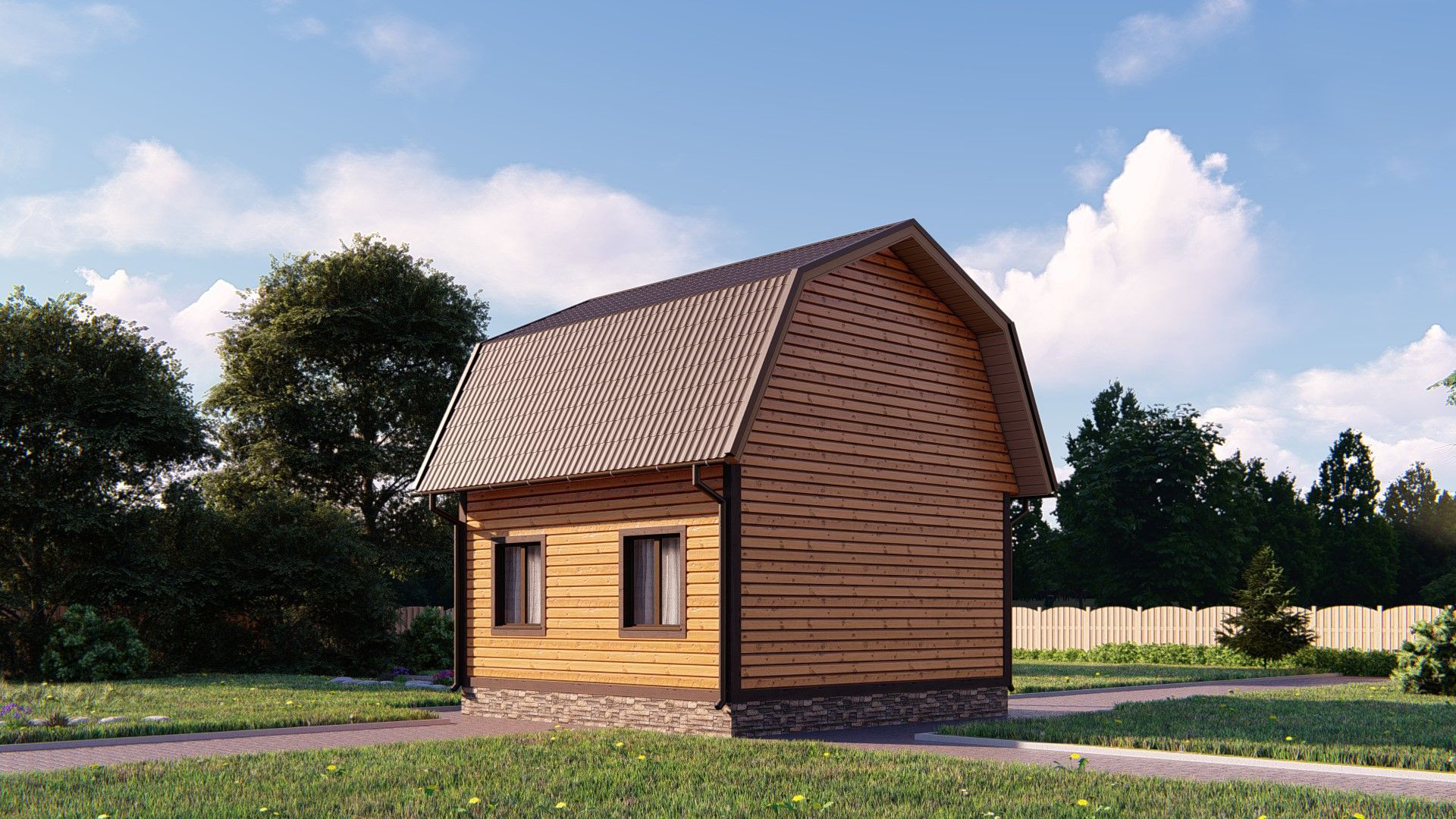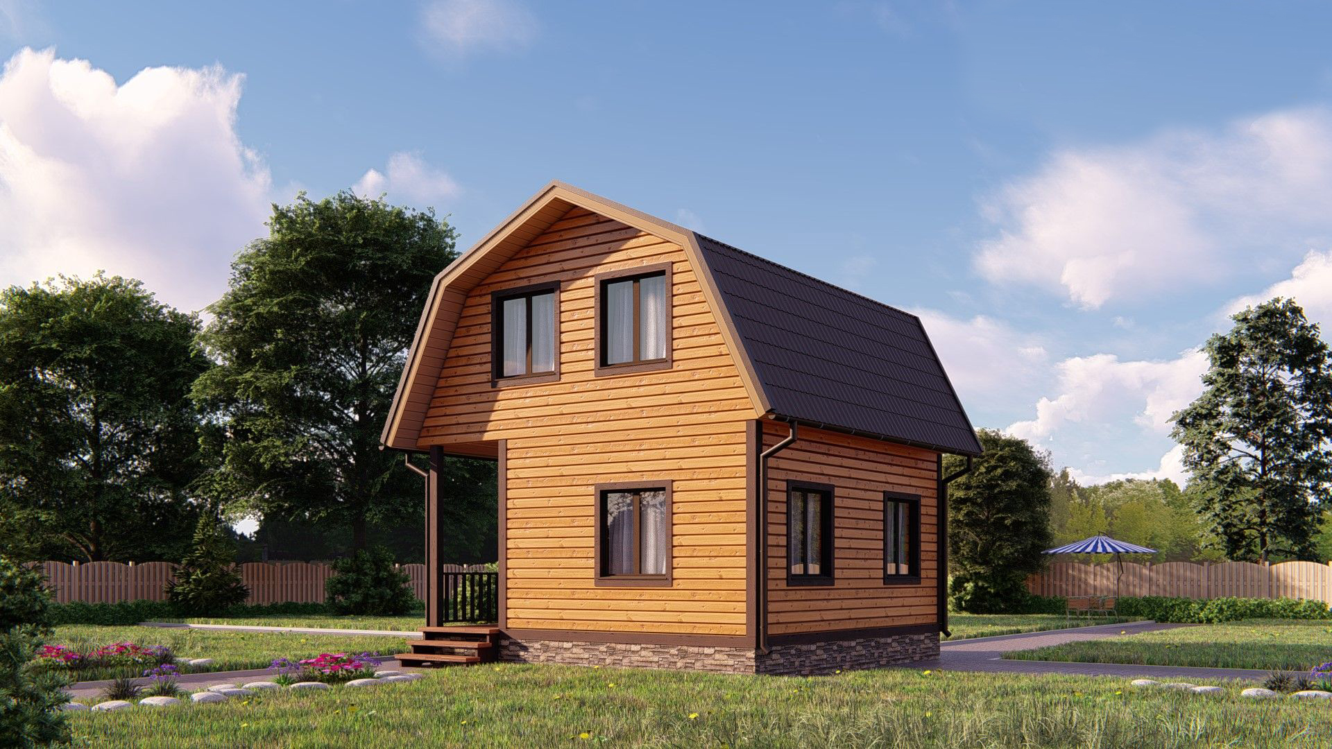 Двухэтажный дом «Вернер» с коробкой 6*6 и жилой площадью 55 квадратных метров для воплощения ваших идей и дизайнерских решений. Вы можете сами распланировать расположение перегородок, количество комнат и служебных помещений, добавить террасу, окна и двери, выбрать тип покрытия. Постройка полностью выполнена из дерева по каркасной технологии, основана на фундаменте из бетонных блоков. Все стыки и соединения максимально обработаны для защиты от влаги и осадков. Срок выполнения работ от 7 до 30 рабочих дней в зависимости от сложности проекта.